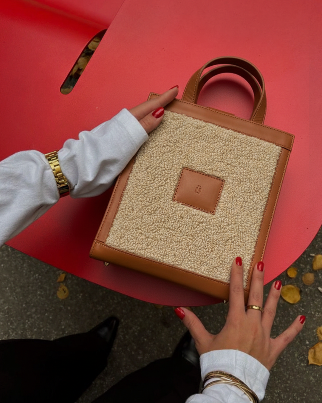 Ce sac est un tote structuré à la forme carrée, confectionné en véritable cuir cognac et en matière teddy douce et texturée. Le corps du sac est composé d’un panneau en teddy crème, apportant chaleur et relief, élégamment encadré par des finitions en cuir cognac lisse pour un contraste raffiné.