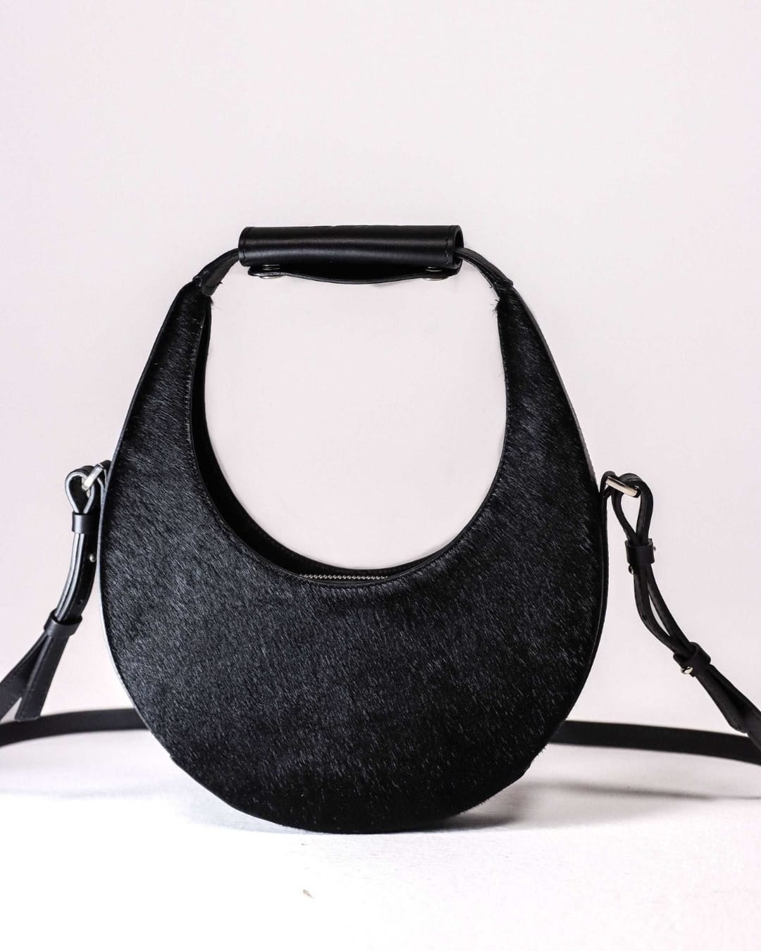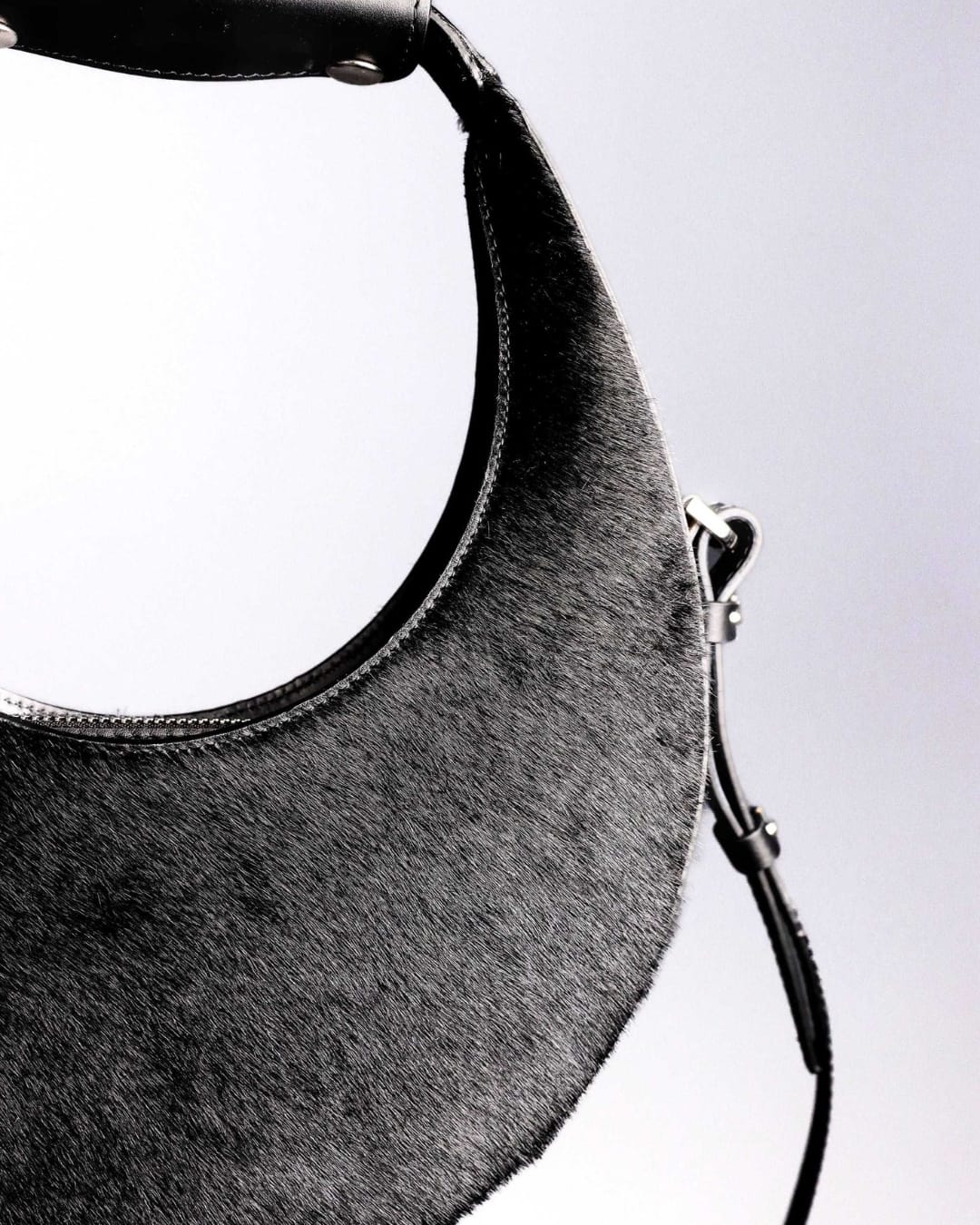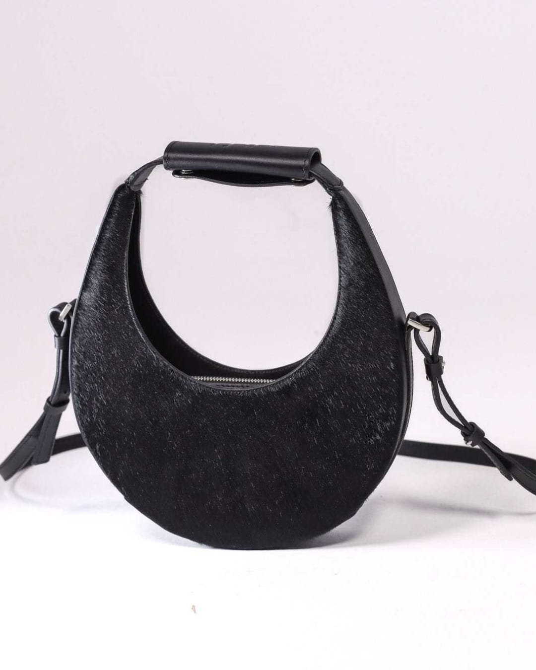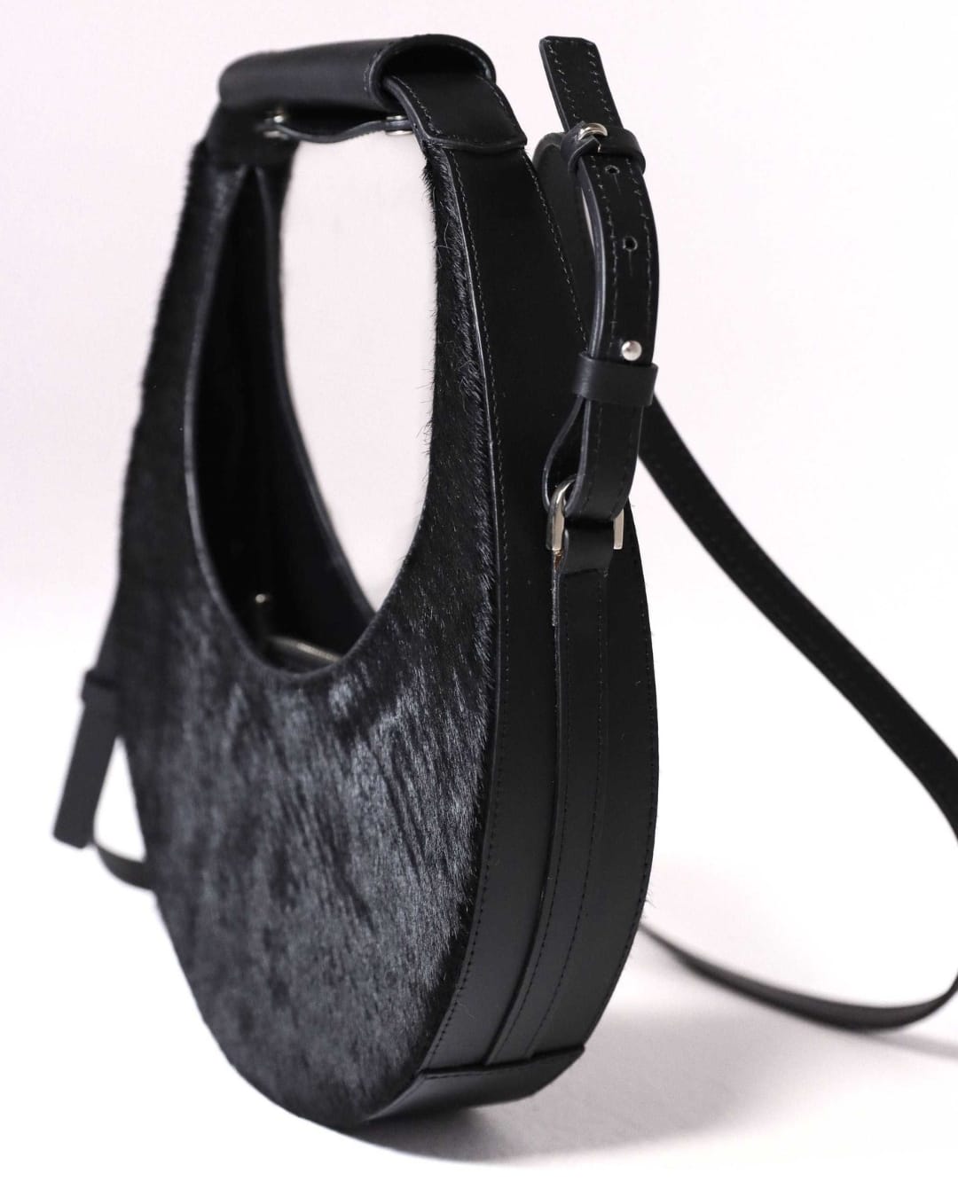 Ce sac demi-lune mêle cuir lisse et peau texturée pour créer un jeu de contrastes subtil, à la fois