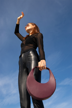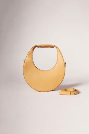 Ce sac demi-lune, entièrement façonné à la main, se porte en bandoulière ou à l’épaule. Il